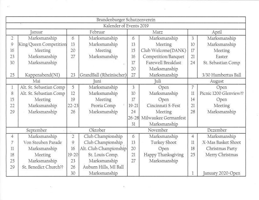 October 19: Semi-Annual, Formal Meeting, dust off your uniforms and wear them if you have them, this meeting is a must for all club members. Reconnect with friends, if you have been away for awhile and enjoy the gemuetlichkeit of the night. Pending shooting awards will also be awarded to those that have earned them. See everyone there!