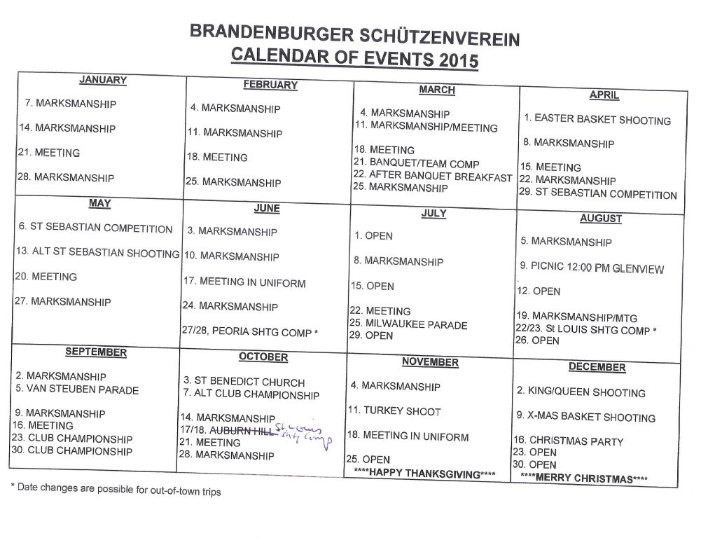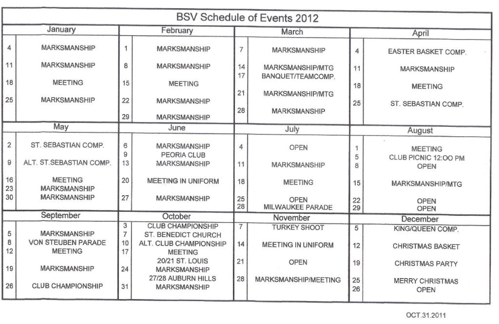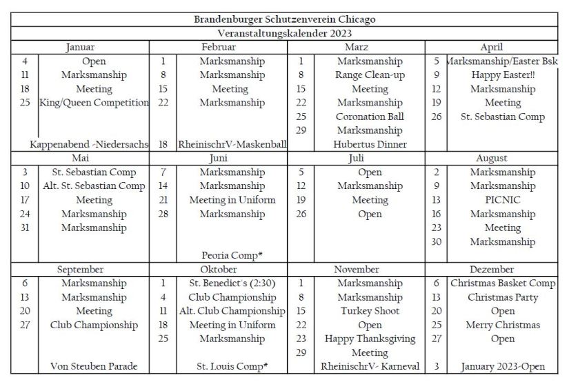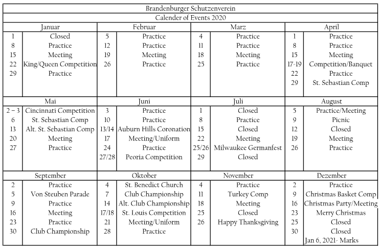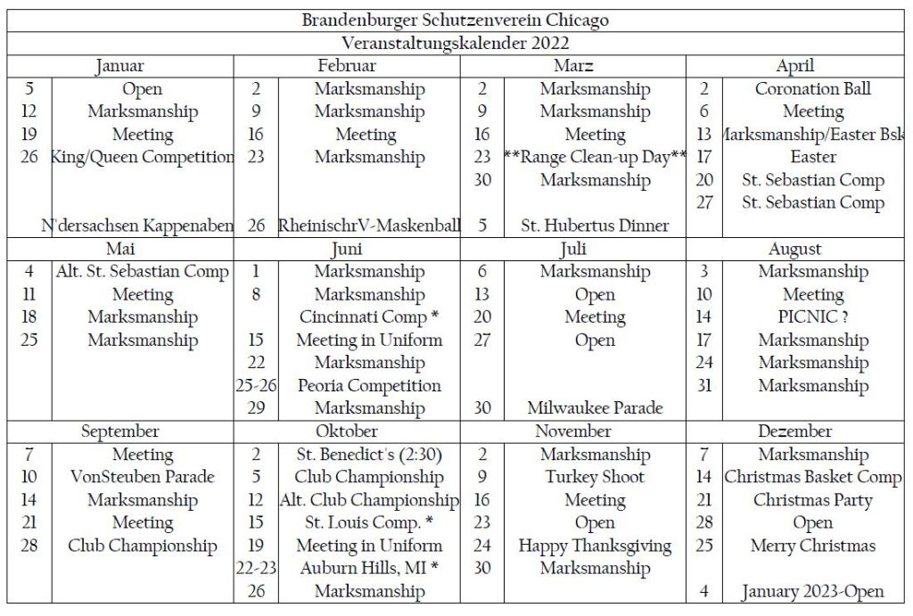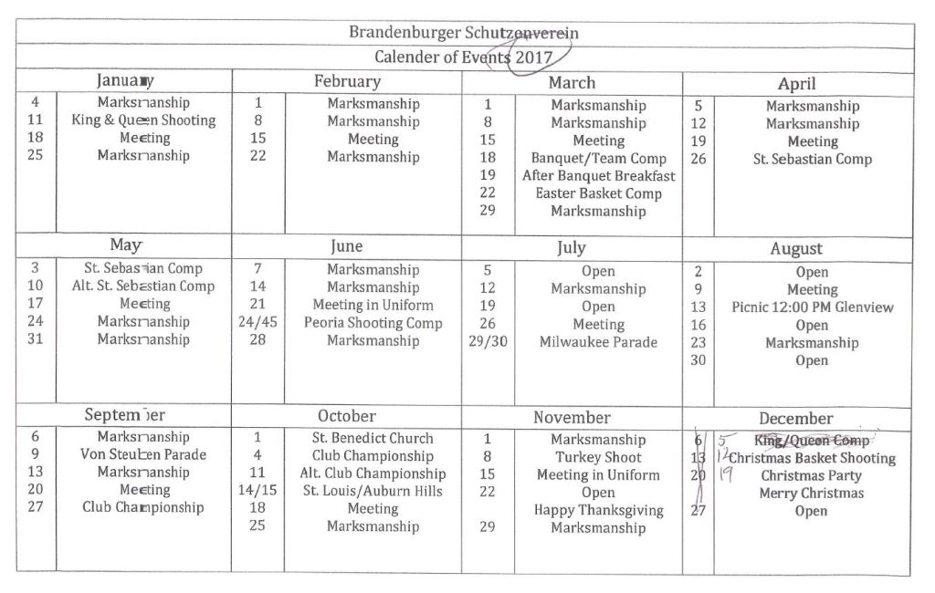 October 15-16: Annual St. Louis Marksmanship and Ball. Join the club on the trek down to St. Louis and compete for shooting honors. If your interested in attending, please contact the Schiesswart about travel and room arrangements.