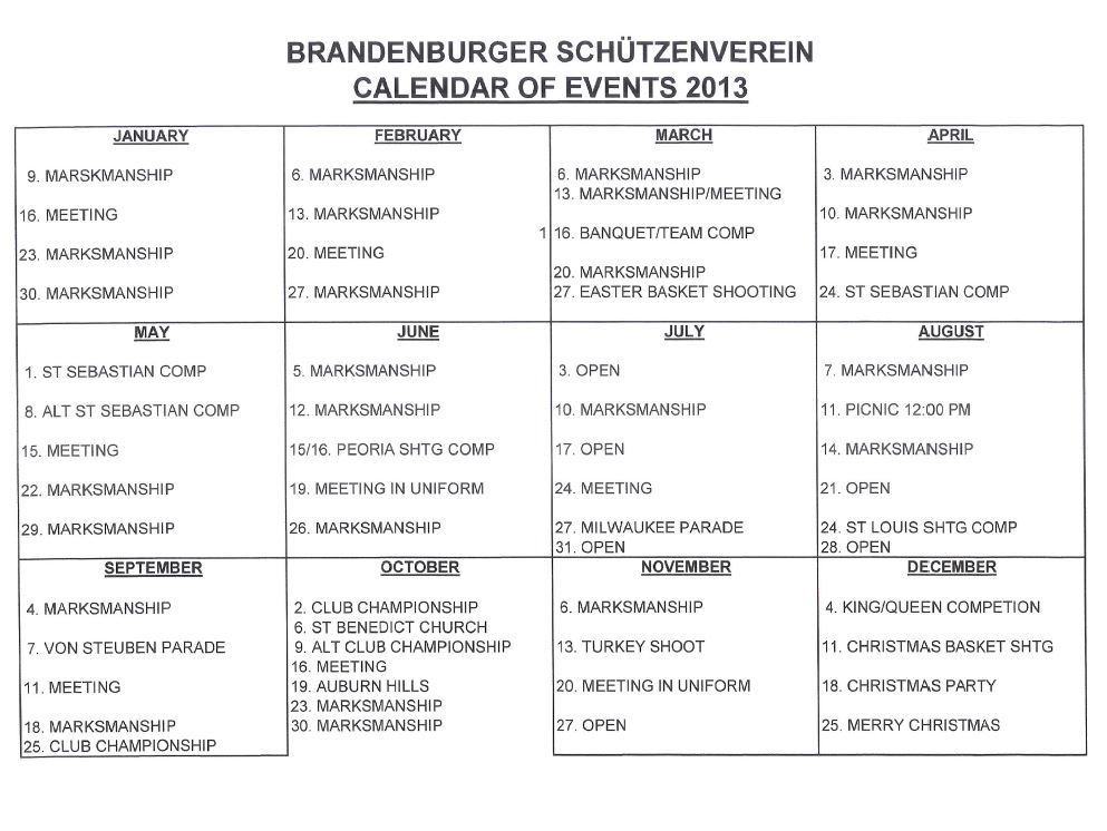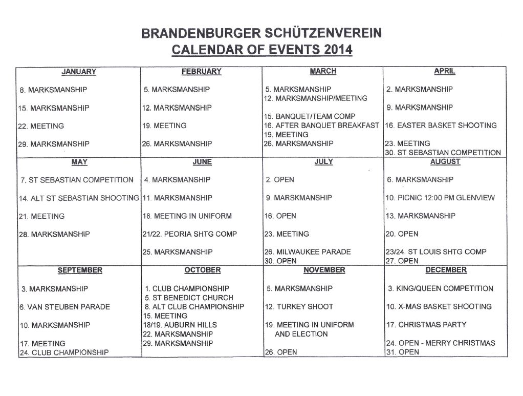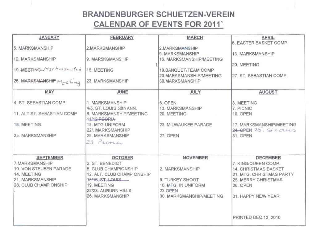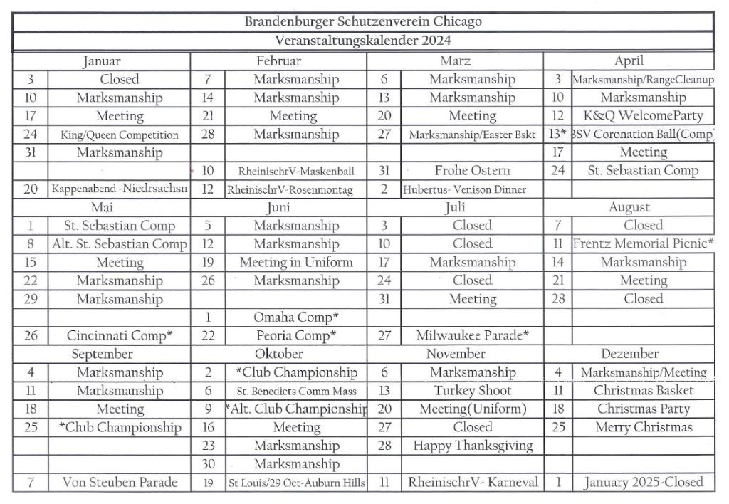 October 15-16: Annual St. Louis Marksmanship and Ball. Join the club on the trek down to St. Louis and compete for shooting honors. If your interested in attending, please contact the Schiesswart about travel and room arrangements.