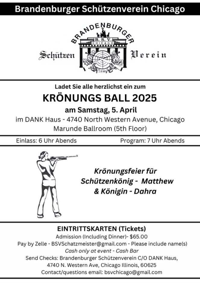 March 25: (SOLD OUT) Saturday morning begins with our annual invitational shoot to take home the Wanderpokal. Even if you are not shooting, come out and enjoy breakfast and root on the BSV. Then, that evening is our King & Queen Ball, held in the Marunde Saal, on the 5th Floor. Catering is from Himmel’s, Musik is by Paloma and the revelers from across the Midwest. Representatives from Michigan, Missouri, Ohio and of course Illinois will all come together to install King Larry and Queen Dahra into their new positions.