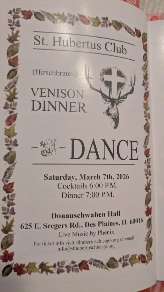 1 March*: St Hubertus annual Dinner (Hirschbraten) and Dance at the Donauschwaben Hall in Des Plaines. Amazing food, and still only 65 bucks a ticket.