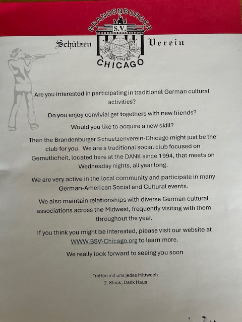 The Schuetzenverein tradition is unfamiliar to many Americans, even those with German roots. For an amusing take on a first timers exposure to our club, check out local bon vivant, Fuzzy his article here. https://fuzzyco.com/news/chicago/bsv.html