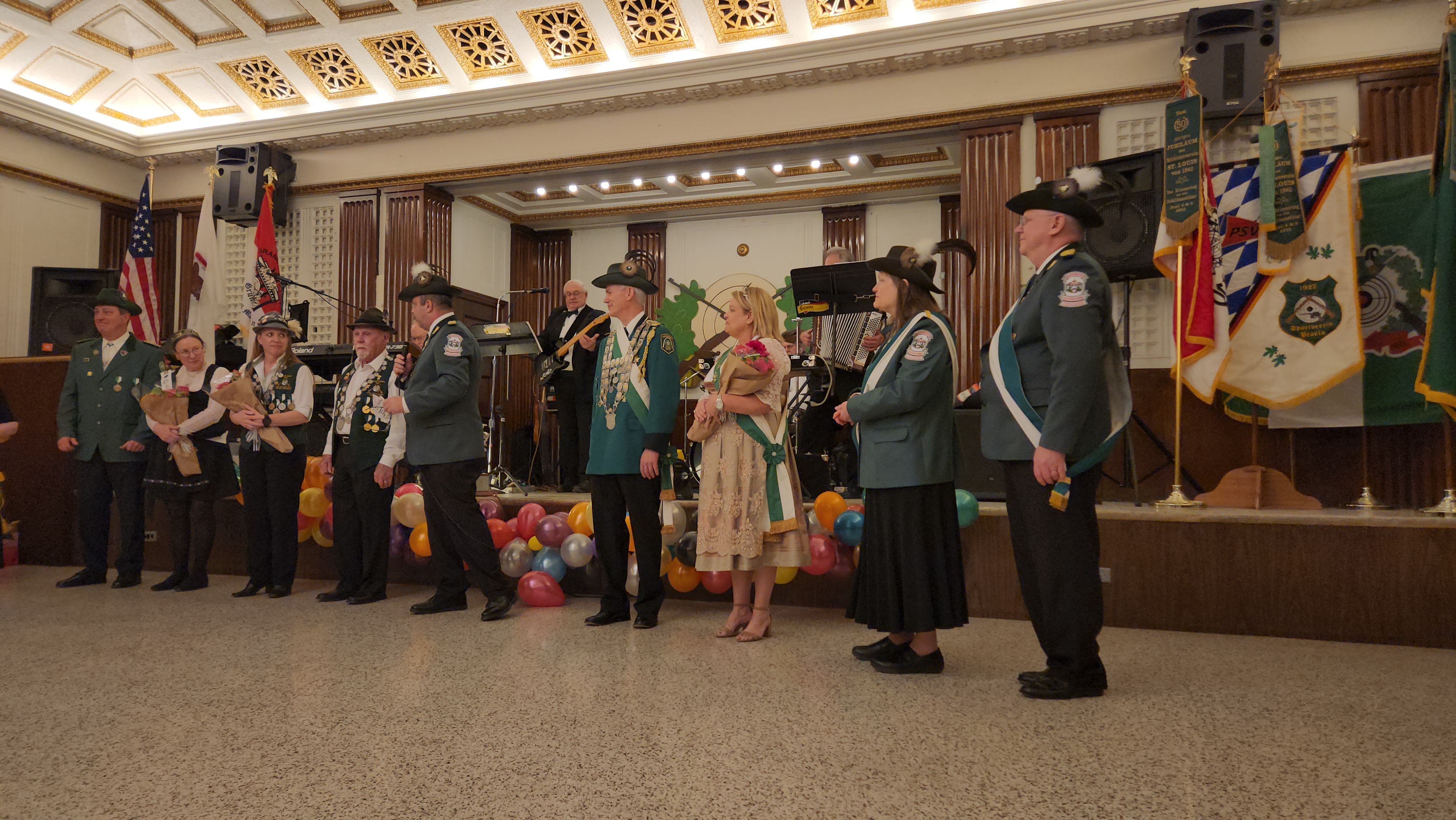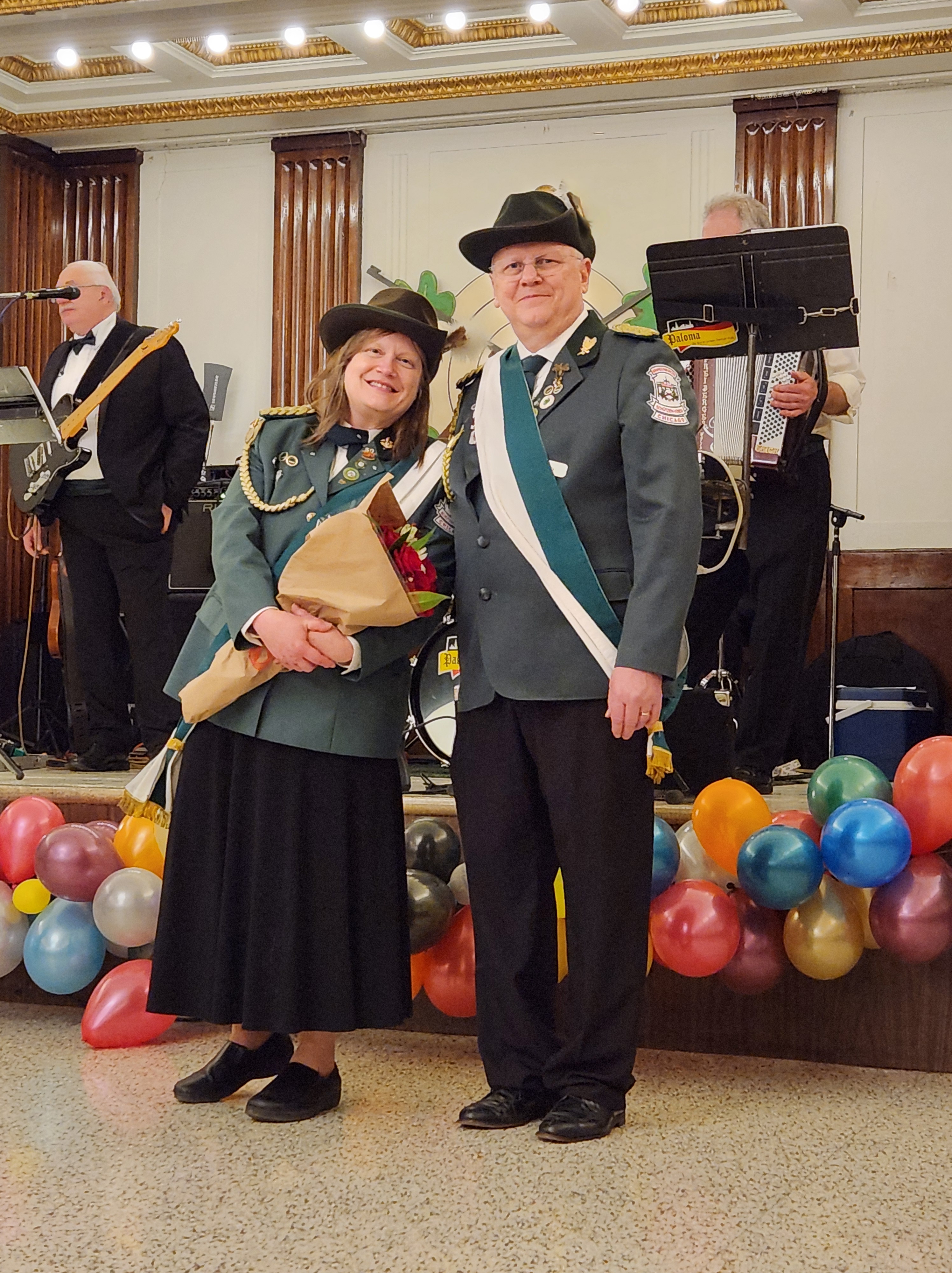 On October 4th the German American Police Association celebrated their 50th anniversary with an Octoberfest party at the Elmcrest in Elmwood Park, Illinois. Reigning BSV King Matt Hoppe, BSV President, and wife Mr and Mrs John Fuller, as well as the BSV Schiesswart, and his bride, Gale and Nancy Fabisch and BSV member Dagmar Freiberger all were in attendance. Notably, BSV member Erich Freiberger, and his band Paloma provided their usual level of excellent entertainment. Pic Below.