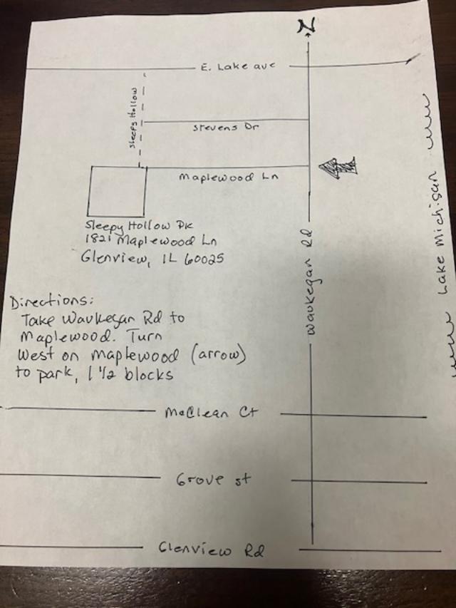 Directions: Sleepy Hollow Park is in nearby Glenview, Illinois. Sleepy Hollow is located at 1821 Maplewood Lane, Glenview, 60025. Simply take Waukegan Road north until you reach Maplewood. Maplewood is the second street south of E Lake avenue, (so if you see Lake, you have gone a little to far!), and turn left, W/B onto Maplewood. Drive west on Maplewood for a block and a quarter, to arrive at the park